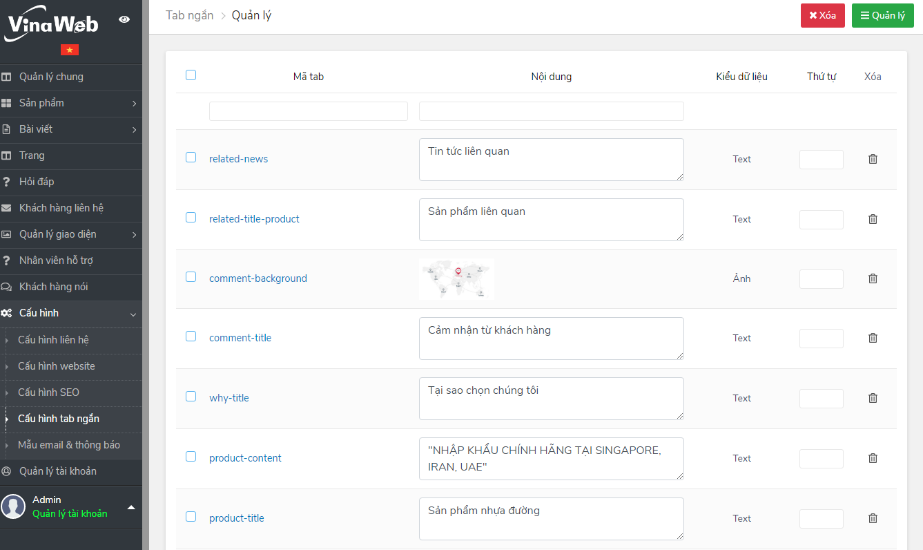 Bạn vào Cấu hình -> Cấu hình tab ngắn -> và nhập dữ liệu vào các ô tương ứng ở cột Nội dung, nhập xong hệ thống sẽ tự động lưu lại.
