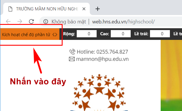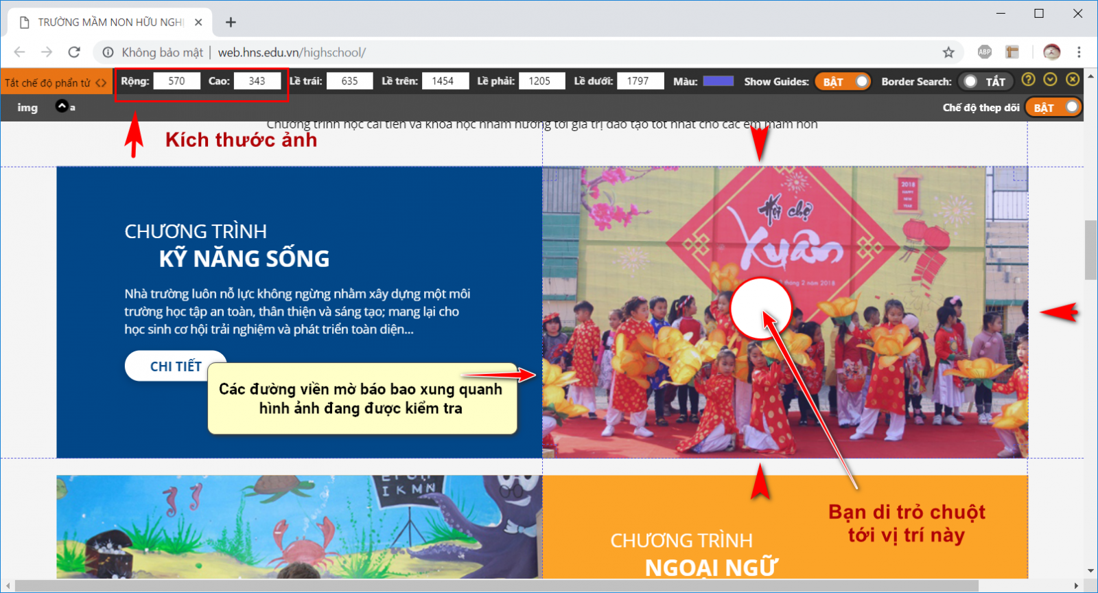 Bước 4: Bạn đưa trỏ chuột tới phần tử (hình ảnh) cần kiểm tra kích thước. Tiện ích sẽ hiển thị kích thước ở góc trên bên trái màn hình.