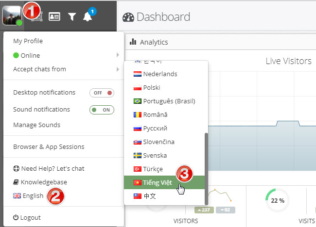 Khi Khách chat trên website, hệ thống sẽ thông báo. Để chat lại với khách, bạn nhấn vào thông báo bên cột trái.